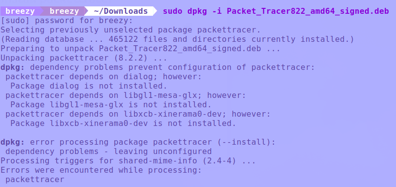To install CISCO Packet tracer you do the following command sudo dpkg -i Packet_Tracer822_amd64_signed.deb, please note if you downloaded a different version you will need to modify that to the version you selected. You can also install using package installer GUI. If you’re running Ubuntu 22.04 or 24.04 you will be faced with an error over a dependency package. CISCO Packet Tracer requires libgll-mesa-glx and libxcb-xinerama0-dev